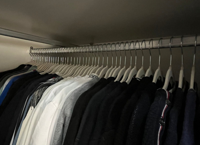 改造完成后,我们先把她家所有的衣服都清空,筛选出一批需要“断舍离”的物品,再把剩下的衣物重新分类,上架悬挂。这时候有的客户会希望按照季节,或按颜色、按长短分类悬挂,整理师也会按照客户的要求和实际情况给出收纳建议,最后贴上标签,完成清洁收尾工作。