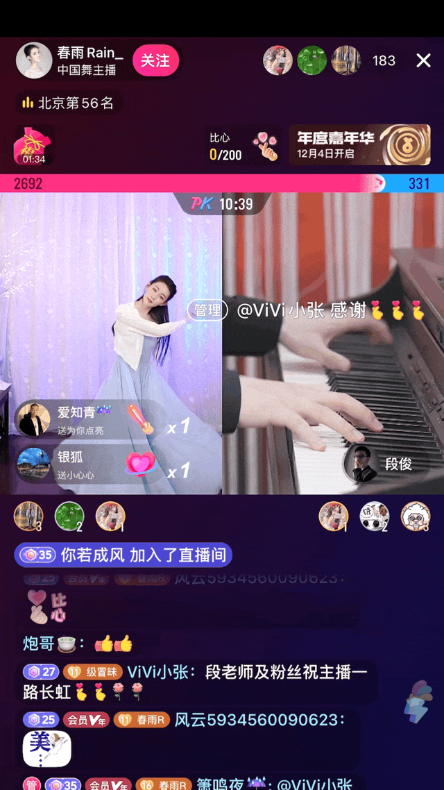如果说乐器和乐器的PK是同类竞技,总能比个输赢,那段俊和舞蹈家春雨的直播pk,更像是一场高质量的文艺汇演:去除了灯光、舞台布景,钢琴声和舞蹈的合作是最接近舞蹈表演的时候。