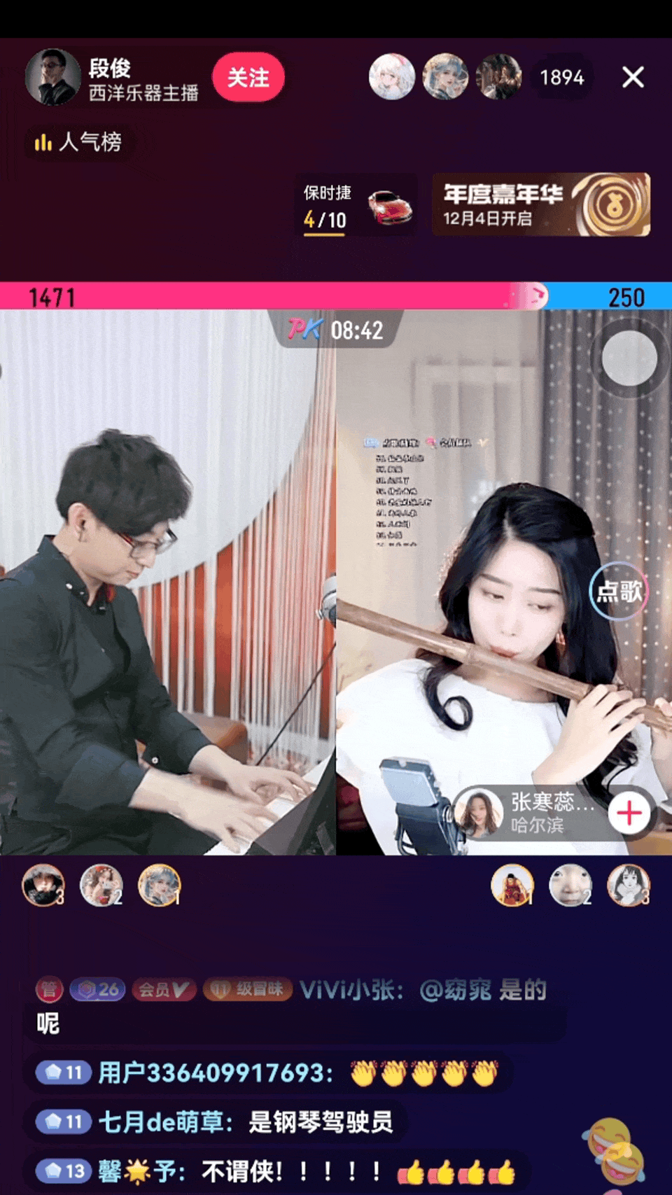 段俊和古筝爱好者@孔叁san 选择了兼具流行和传统风格的《青花瓷》作为pk曲,本以为音色独特的中国传统弦乐很难与其他乐器融合,而当音乐一起,钢琴沉稳,古筝悠扬。直播粉丝们瞬间疯狂打Call。
