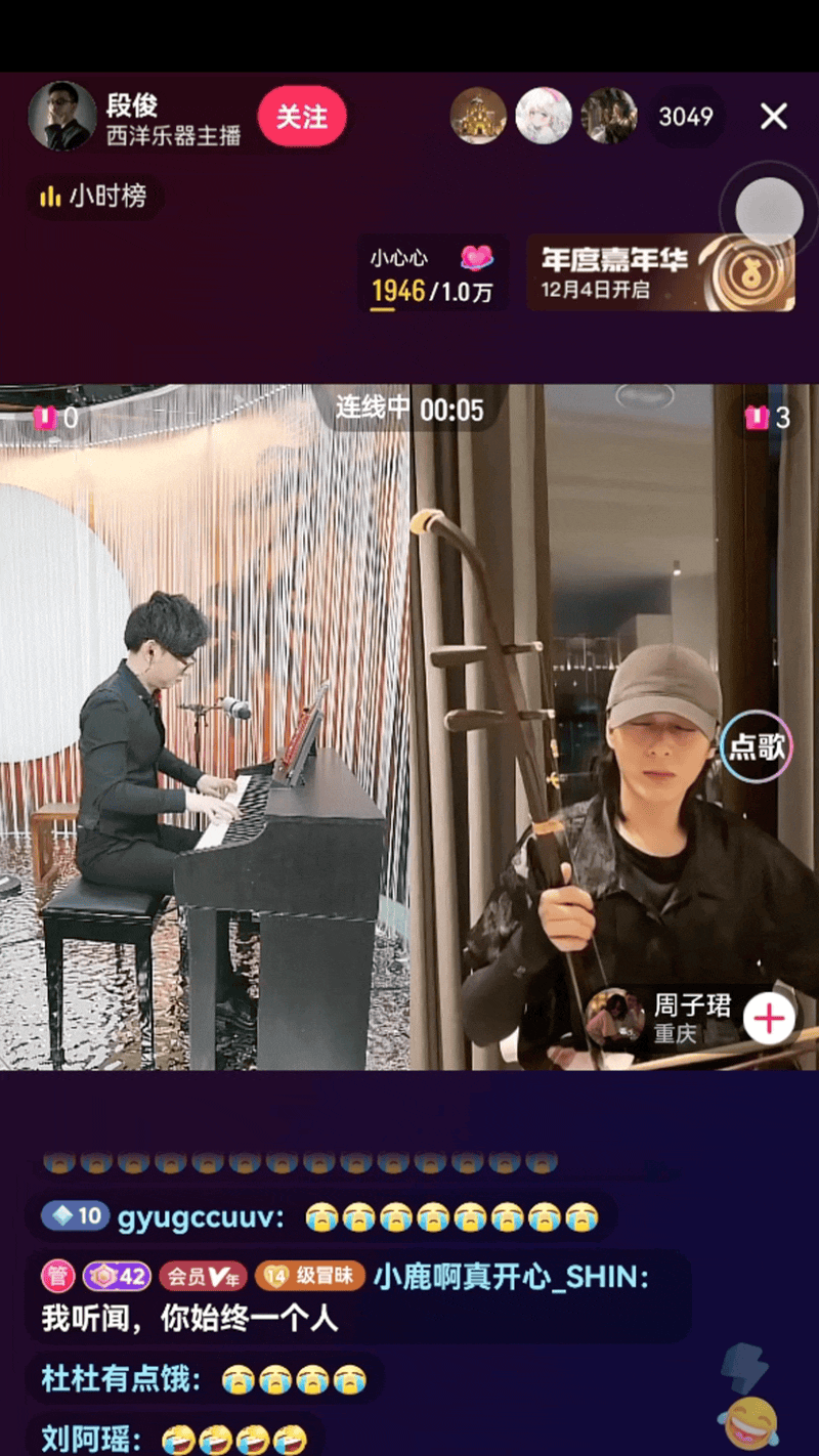 吸引了我的那条直播视频,就排在抖音直播pk话题的第一页,是抖音博主周子珺与段俊的PK直播片段:两人隔空对战,一个拉二胡,一个抚钢琴,一中一西,说是pk,不仅没有火药味,反而呈现出琴瑟和弦的悠远感。