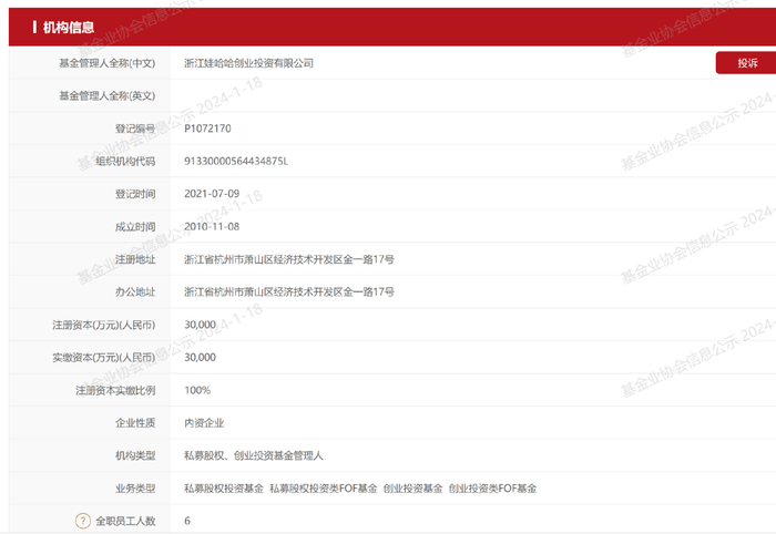 同月9日,浙江娃哈哈创业投资有限公司在中基协完成登记,注册资本3亿元,由娃哈哈宏振投资和施幼珍共同持股。其中,持股比例90%的娃哈哈宏振投资为宗庆后全资控股企业。而持10%的施幼珍是宗庆后妻子。