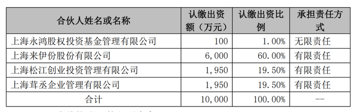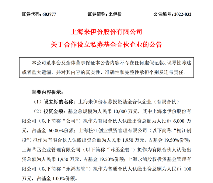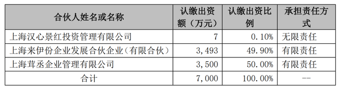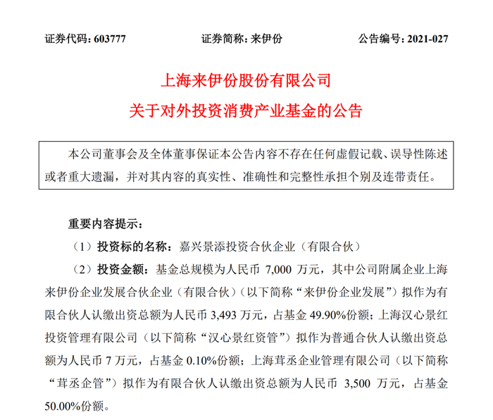 公告上显示,该基金总规模为7000万元,“来伊份企业发展”拟作为有限合伙人认缴出资总额为3493万元,占基金49.9%份额。“汉心景红资管”拟作为普通合伙人认缴出资总额为人民币7万元,占基金0.10%份额;“茸丞企管”拟作为有限合伙人认缴出资总额为人民币3500万元,占基金50%份额。