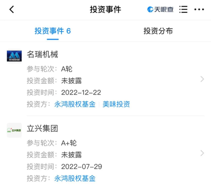 值得注意的是,有了来伊份加入之后,永鸿股权基金先后投资立兴集团和名瑞机械。前者是专注于罐头加工、真空冷冻干燥食物生产、速溶茶浓缩茶等;后者主要生产全自动给袋式包装机于全自动给袋式真空包装机。