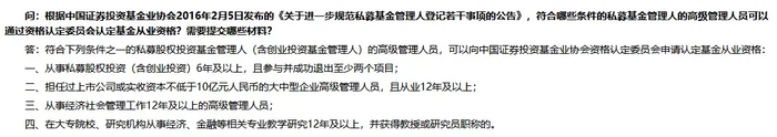 基金业协会规定,对从业年限、退出项目数量、管理资本量等条件符合要求并有相关材料证明及推荐人的私募基金管理人高管,无须通过考试,即可申请基金从业资格认定。