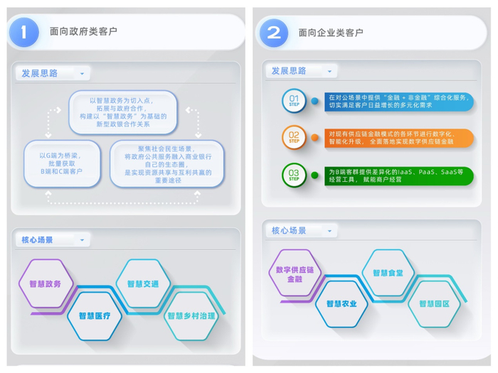 特别是目前,商业银行正在基于开放银行架构,结合自身优势,在多元化场景中广泛开展对公业务场景金融的探索与合作,一些实力雄厚的大中型银行,以及部分领先的区域性银行(包括城商行、农商行等),均已在政府机构和行业领域中构建了一定先发优势。