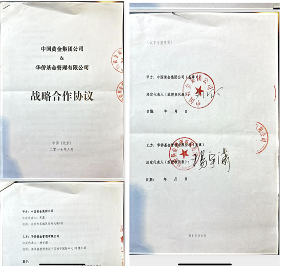 中国黄金集团及其下属公司9月中旬发表声明,称与浙江华侨系从未合作,华侨系相关协议,系冒用中国黄金及旗下中鑫国际等公司为签约方,并伪造中国黄金旗下多家公司公章和法定代表人名章。