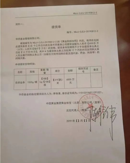 ▲左一为杨宇潇;右二为陈雄伟此前多名投资者向第一财经记者展示,华侨系业务人员展示的流水单,以及线下提金销售凭证,均显示交易对手为中国黄金集团,以投资者获得的一张提货单为例(见下图),中金北京向华侨基金公司承诺,在见此提货单后3个工作日内将无条件同意华侨基金提取相应金额的投资金条。该提货单由中金北京盖章,并由陈雄伟签字。
