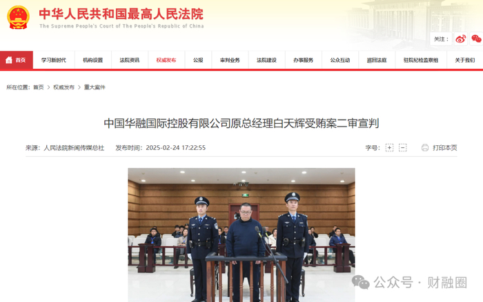 据最高人民法院消息,2月24日,天津市高级人民法院对中国华融国际控股有限公司原总经理白天辉受贿上诉案二审公开宣判,裁定驳回上诉,维持死刑判决,并依法报请最高人民法院核准。