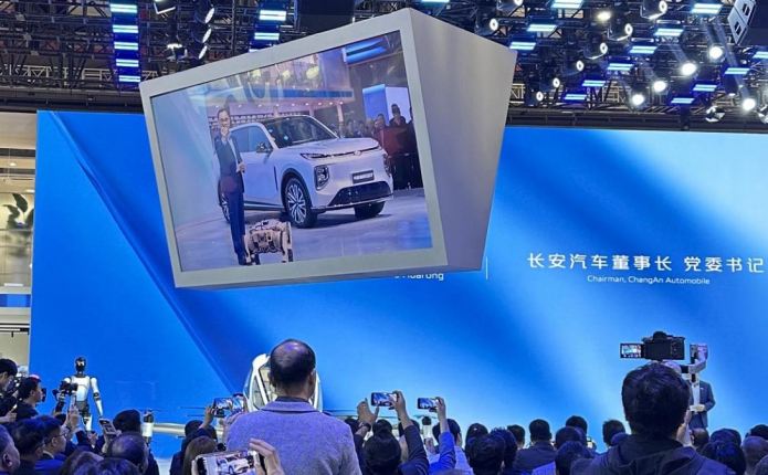 4月23日上午9点,长安汽车董事长朱华荣现身发布会。上台后,他称忘记带翻译器,片刻后机器狗“来福”给他送了过去。舞台一侧,还展示了人形机器人,以及长安与亿航智能联合打造的飞行汽车。
