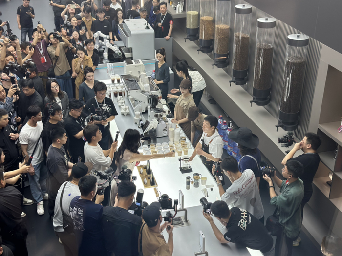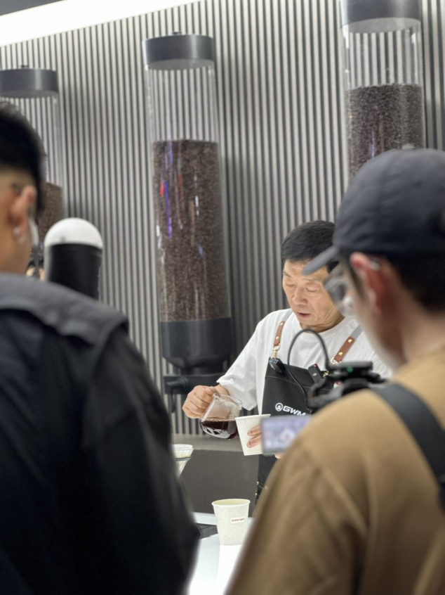 ▲不少媒体在长城汽车展台围观魏建军制作咖啡。摄影:任娅斐不过,原本预告10点钟现身的魏建军直到十点半才姗姗来迟。他穿着一件印有长城汽车LOGO的围裙,穿过人群走到咖啡台旁,研磨、倒粉、注水、滴滤萃取、装杯,动作娴熟。