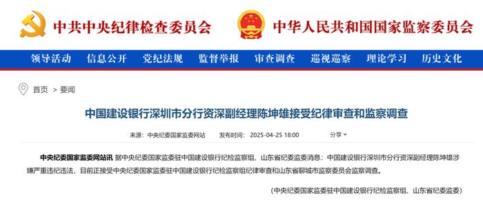 4月25日,据中央纪委国家监委驻中国建设银行纪检监察组、山东省纪委监委消息:中国建设银行深圳市分行资深副经理陈坤雄涉嫌严重违纪违法,目前正接受中央纪委国家监委驻中国建设银行纪检监察组纪律审查和山东省聊城市监察委员会监察调查。