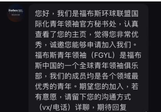 ▲图源:小红书@陈可caroline“我拒绝了福布斯”文学的灵感来源也大多是这个俱乐部。一位拒绝者直言,“FGA是一项需要付费的商业荣誉,这一点常常在各大博主的报喜中被隐去。”