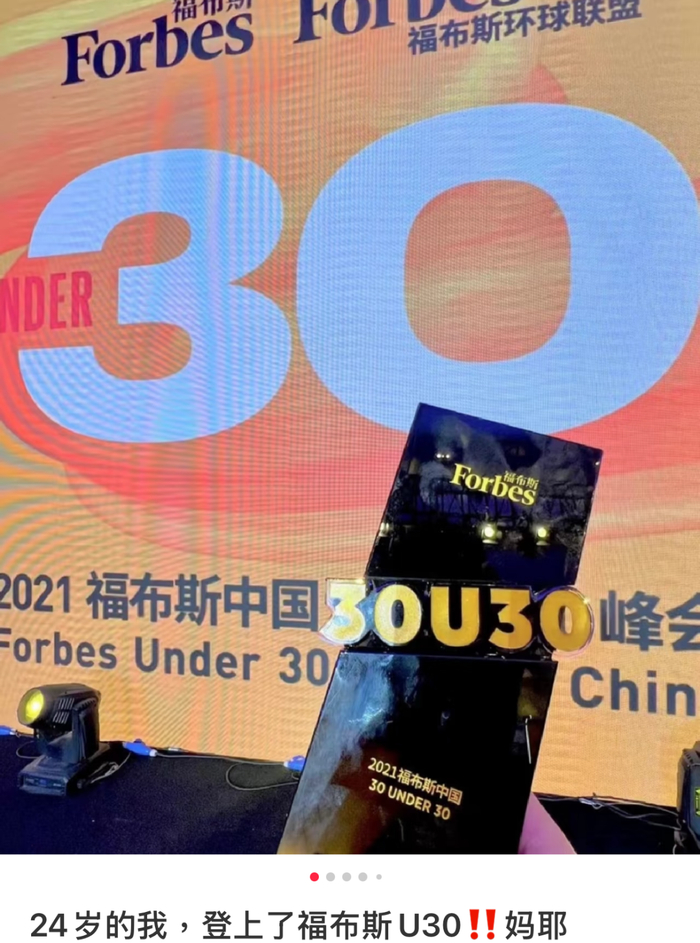 ▲图源:小红书@公子伊在社交平台主页里总有一支视频、两篇图文详述自己的福布斯登榜经历:首图是一张自己在榜单上的头像截图,右下角显眼处是“Forbes 30”的黑标;文案先回顾“19岁辍学创业无人理解”的寂寞,结尾再感谢福布斯的厚爱和过去的自己。