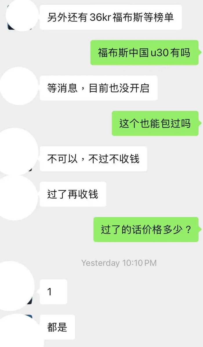 Bob的业务范围很广,除了胡润,也提供36氪、福布斯等等其他榜单的包装服务。收费依旧是1万元,但不能保证上榜。