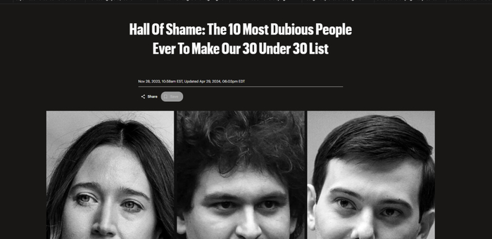 2023年,福布斯在官网上发布了“30 under 30耻辱堂”,收录了10位史上“最不光彩”的30 under 30上榜者。有人进了监狱,有人还在吃官司,罪名包括欺诈、歪曲财务状况、伪造数据甚至性犯罪。