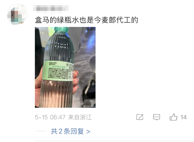 这下子网友反倒是替今麦郎委屈了。食品饮料行业,代工是很常见的事情,连盒马的绿瓶水也是今麦郎代工的。