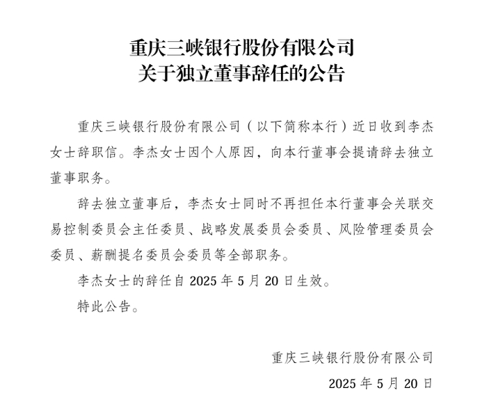 李杰辞任后曾出任重庆三峡银行独立董事至今,而就在上周的5月20日,重庆三峡银行公告显示李杰因个人原因向该行董事会请辞独立董事职务,辞任即日生效。