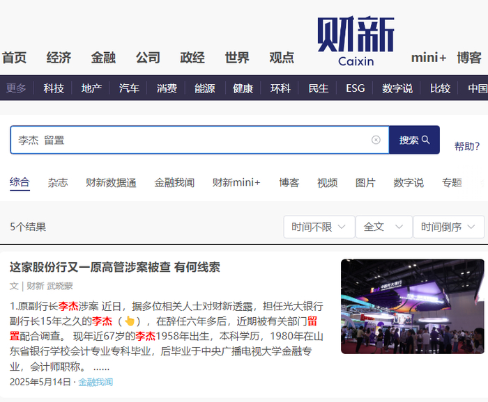 此前5月14日,财新发布《这家股份行又一原高管涉案被查 有何线索》,其内披露光大银行原副行长李杰涉案,近期被有关部门留置配合调查。