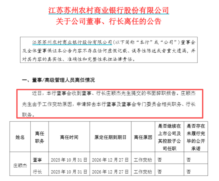 苏农银行表示,近日,该行董事会收到董事、行长庄颖杰先生提交的书面辞职报告。庄颖杰由于工作变动原因,申请辞去该行董事及董事会专门委员会相关职务、行长职务。庄颖杰的离任时间为10月31日,离任后不再继续在苏农银行及该行控股子公司任职。