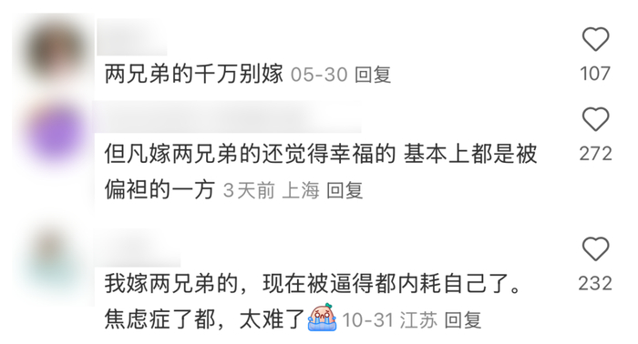 而在不少长辈眼中,两兄弟家庭,才是相亲简历中的最大避雷项。“各地的传统婚俗理念,大多都是男方买房,可这么大的经济支出,家里还要备下两份,必然难做到平等周到。”