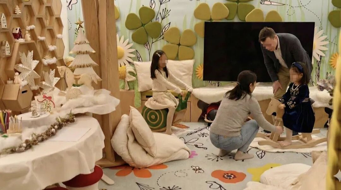 孩子在里面骑木马,不仅有酒店员工,还有中国保姆和外籍私教全程陪着。