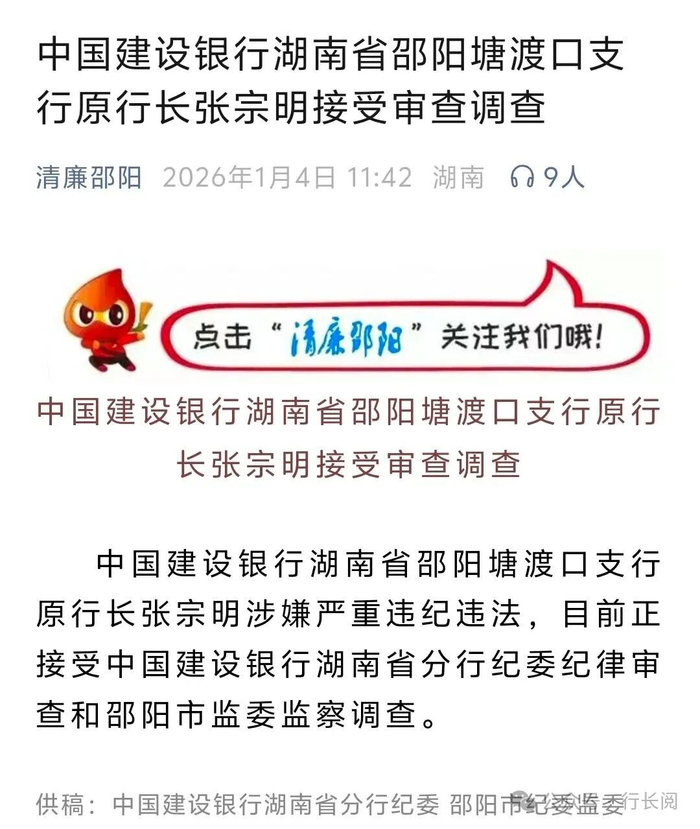 近日,“清廉邵阳”官方通报,中国建设银行湖南省邵阳塘渡口支行原行长张宗明因涉嫌严重违纪违法,正接受纪律审查和监察调查。