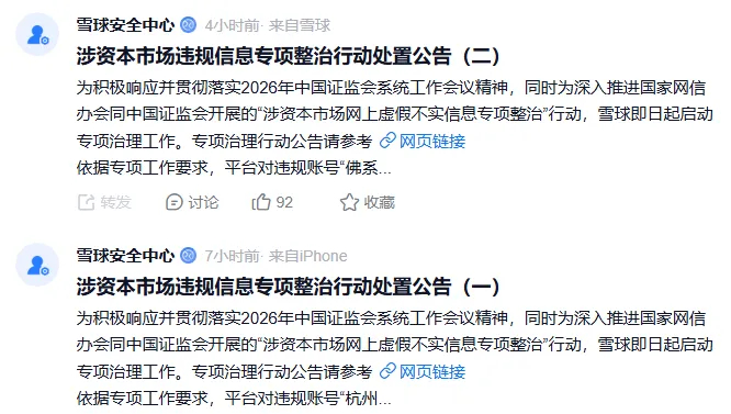 大清早,雪球安全中心就发布公告称,为积极响应并贯彻落实2026年中国证监会系统工作会议精神,同时为深入推进国家网信办会同中国证监会开展的"涉资本市场网上虚假不实信息专项整治"行动,雪球即日起启动专项治理工作。