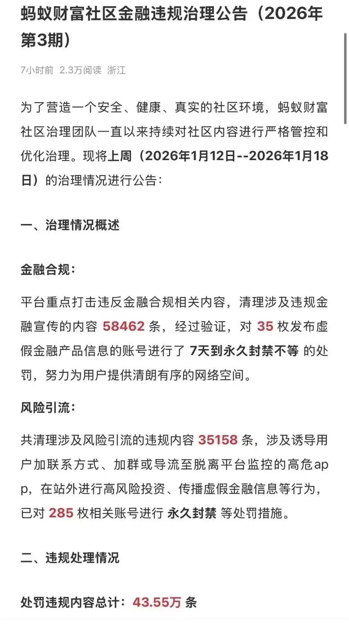 随后蚂蚁、抖音、腾讯等大平台也都宣布,平台除了日常监测和处置,近期有对违规内容的重点打击。蚂蚁财富宣布,近日清理违规金融宣传内容58462条,对35个发布虚假金融产品信息的账号进行了处罚,从7天到永久封禁不等。