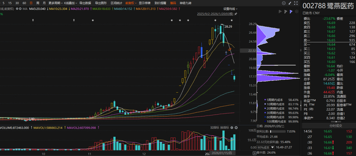 去年12月15日,鹭燕医药股价只有11元/股,接着就在一个月内冲高到28.29元/股,然后开始连续下跌,中间有连续三天都是跌停,6个交易日最大跌幅超过40%。