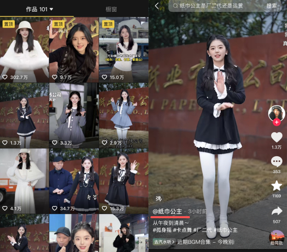 最近比较出名的算是“纸巾公主”。她公开宣称自己是安徽某纸业老板的“真女儿”,通过翻跳歌曲、展示工厂实力等内容火速出圈,近一个月涨粉30万,账号橱窗售出上万件产品,销售额超30万。