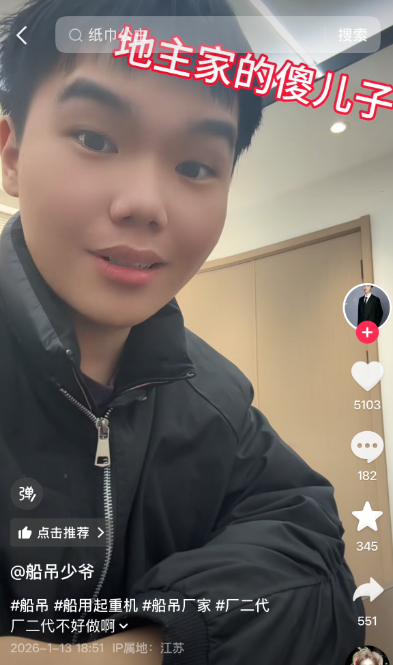 还有一个叫“船吊少爷”,19岁,父母在江苏经营船吊设备厂,客户多为港口企业。自从他用“19岁大学生工厂搬砖”“地主家傻儿子”的反差人设吸引关注后,为家里的生意做了很多导流。