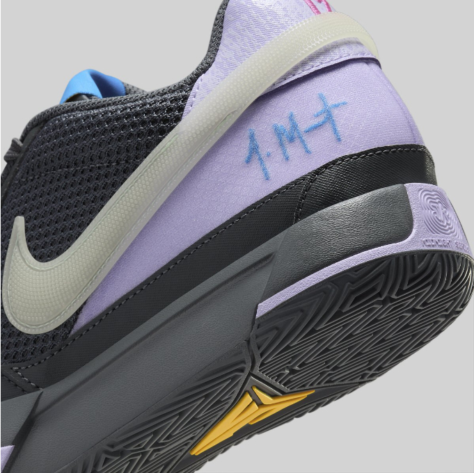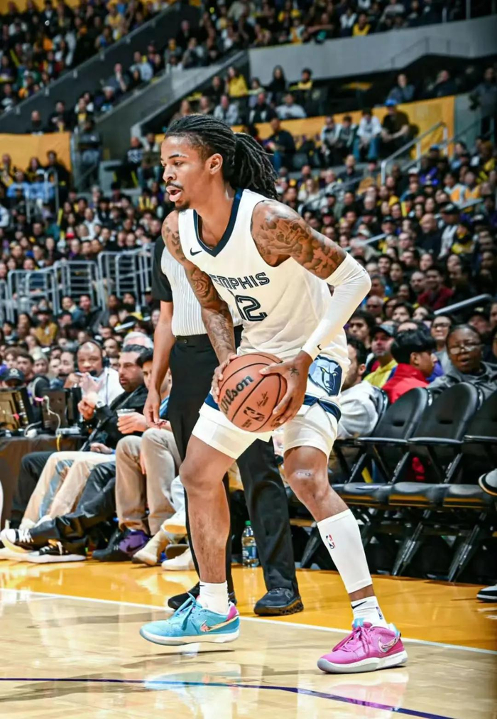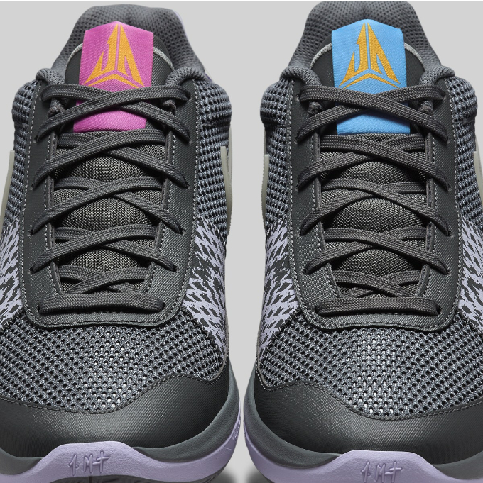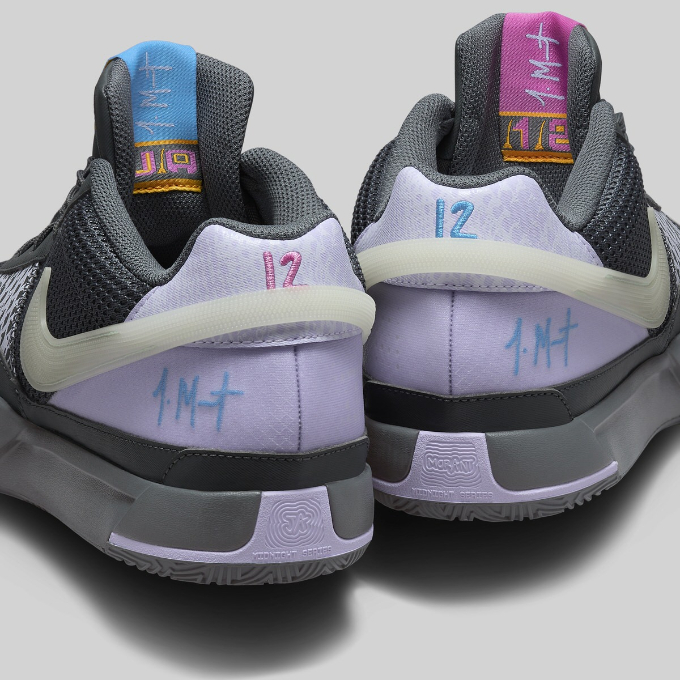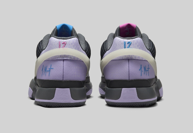 至于尾部,Ja Morant的签名字体做出的立体造型,而他的号码12也分别用蓝粉鸳鸯配置呈现。