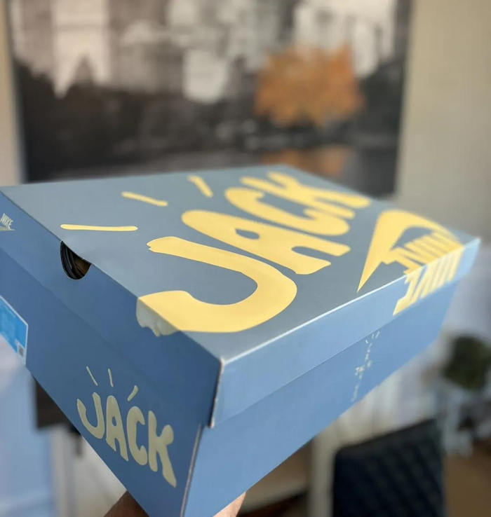 本次鞋盒也一并曝光,整体以蓝色加淡黄色的"JACK"和Nike Logo呈现。