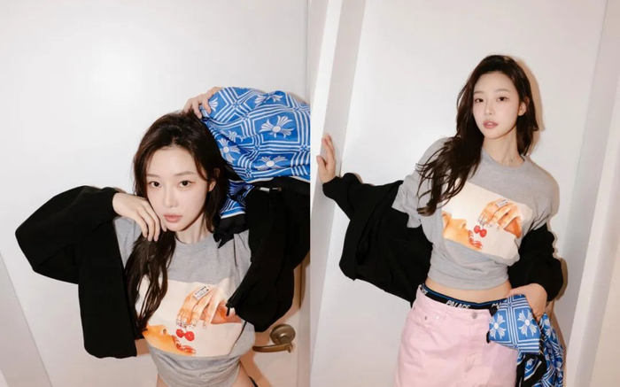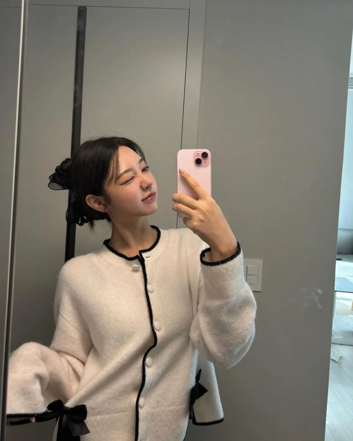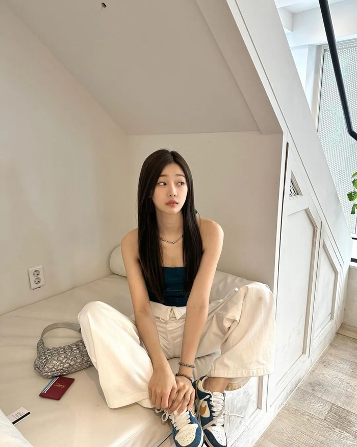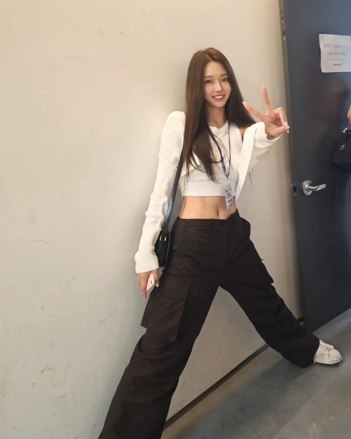 当然除了日常主打的甜美系穿搭,金慧真偶尔也会上身工装裤、宽阔版型的西装等单品,A起来也完全不违和。