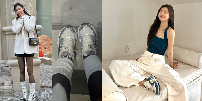 被JJJJound联名带火的Asics Kayano 14液态银,在她私服里也是常客,黑丝+堆堆袜+球鞋也属于是女球鞋玩家的经典公式。