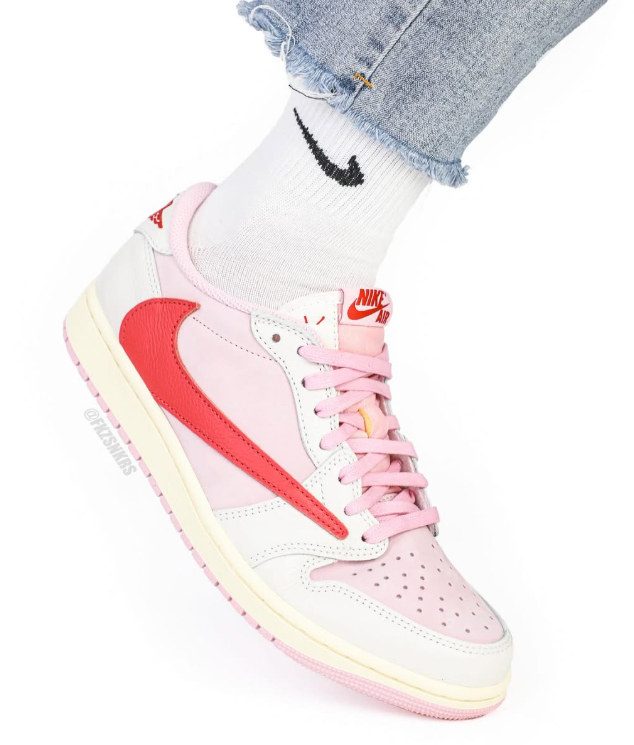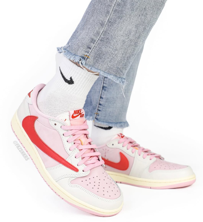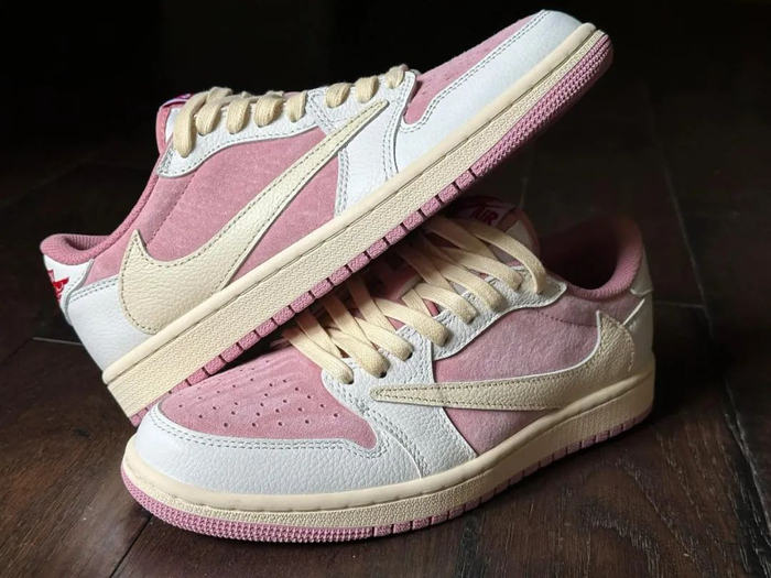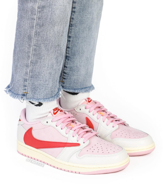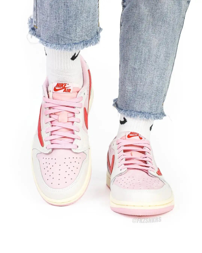 最后,两双Travis Scott × AJ1 Low "Shy Pink"粉倒钩预计将在2026年夏季正式登场,下面附上更多上脚图,感兴趣的朋友还请持续关注,我们也会第一时间带来最新相关情报。