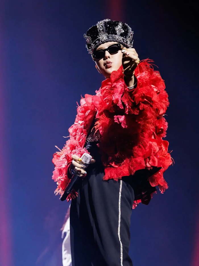 演出时的红色花卉外套来自Jay Baek Couture独家定制,搭配满钻皇冠帽相当吸睛。