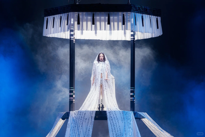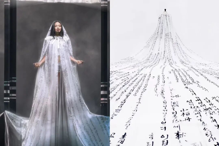 首先开场《Seoul City》的造型就是王炸,Jennie身披15米长的薄纱,满印了有韩文记录以来的最早歌词集《青丘永言》中的句子。