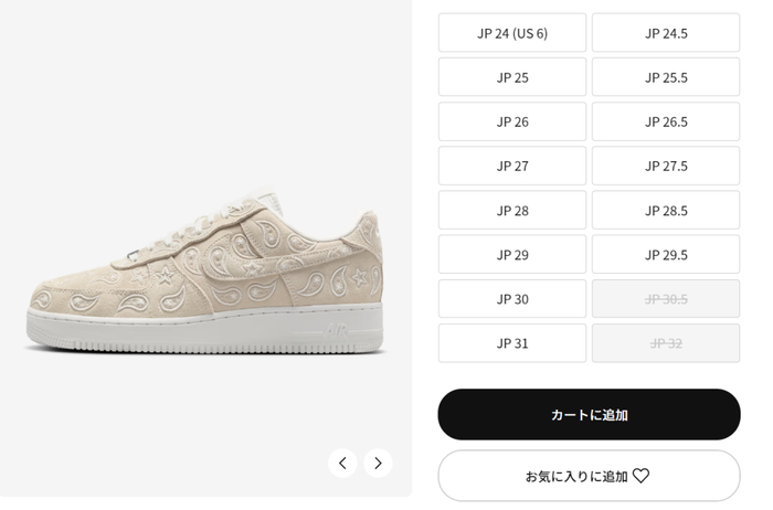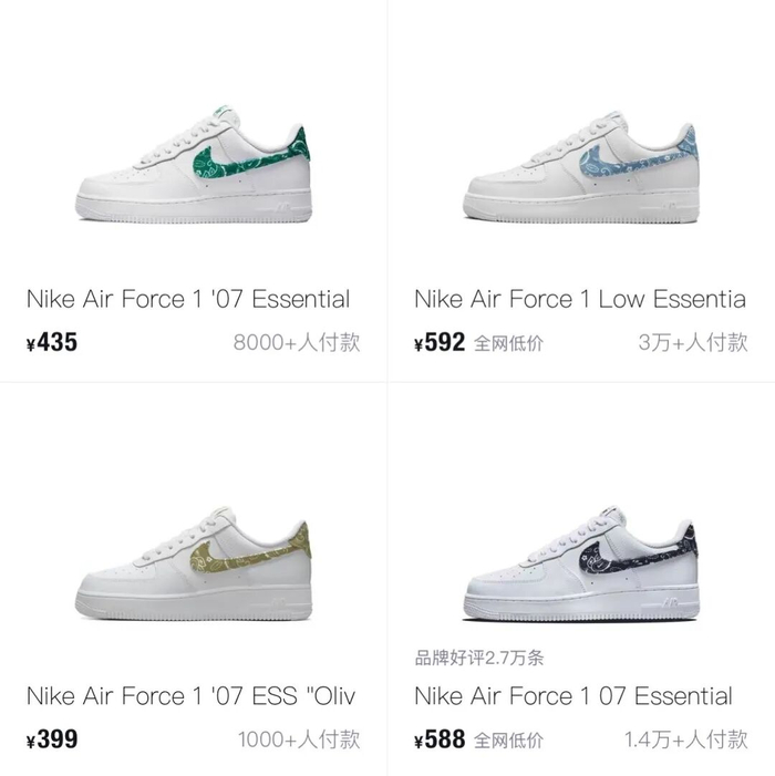 此前Nike就推出过腰果花主题的AF1系列,目前多款配色在二级市场都已经破发,只有少数尺码还有几百元的溢价表现,预计此番全新的麂皮腰果花入手难度也不会太大了。
