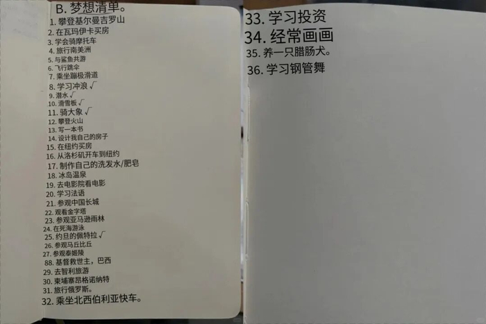 更多小目标包括一系列学习、旅游和跳伞、蹦极、和鲨鱼游泳等运动计划,满满正能量啊。