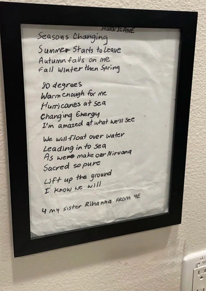 手写稿也是Ye宝相当自豪的创作成果,此前的《Hurricane》歌词手稿就被装裱起来,赠予蕾哈娜。