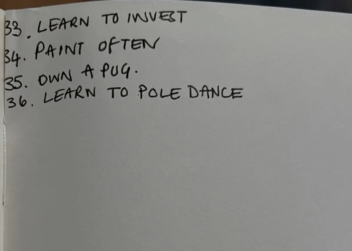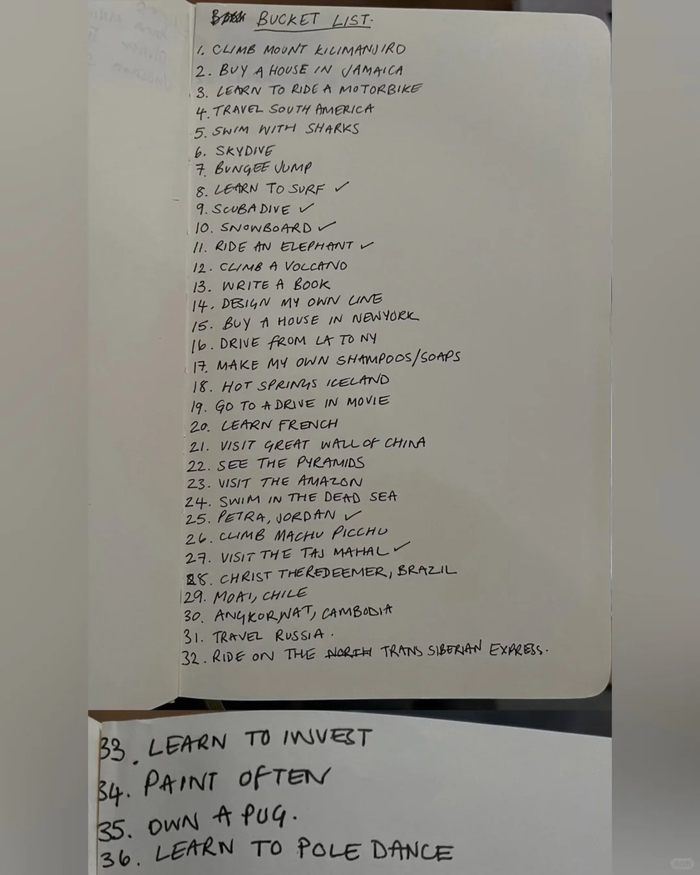 网传清单中,这一时期的Ye宝遗愿列了满满一整页多共36项,无关音乐、商业等内容,包括学冲浪、水肺潜水、单板滑雪、骑大象、约旦佩特拉以及参观泰姬陵等。