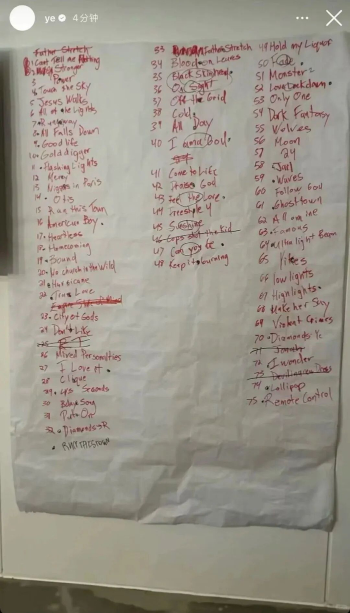 更多关于Ye的墨宝真迹其实完全数不过来,包括海口的试听会前夕,也曾在Ins快拍上偷摸挂出过歪七扭八的手写歌单。