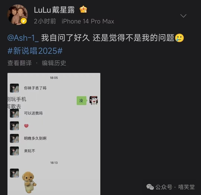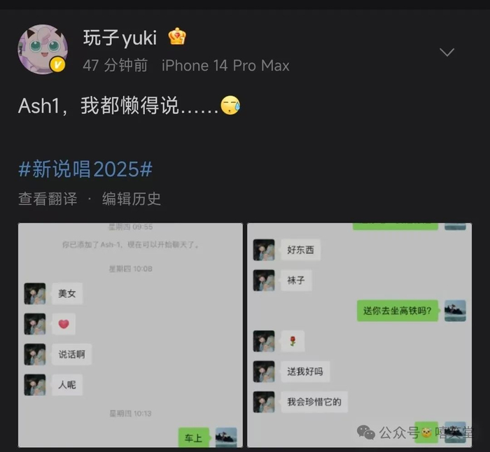 原来,《新说唱2025》参赛选手玩子发出了和另一个选手ASH1的聊天记录。