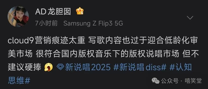 “营销痕迹太重,写歌内容也过于迎合低龄化审美市场,很符合国内版权音乐下的版权说唱市场,但不建议硬捧”