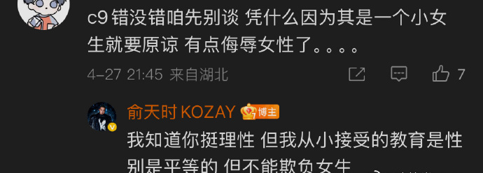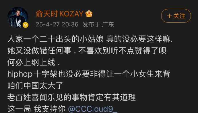 比如魔都说唱大帝!KOZAY俞天时就发声力挺女CLOUD9!