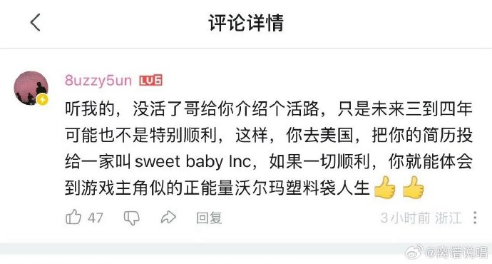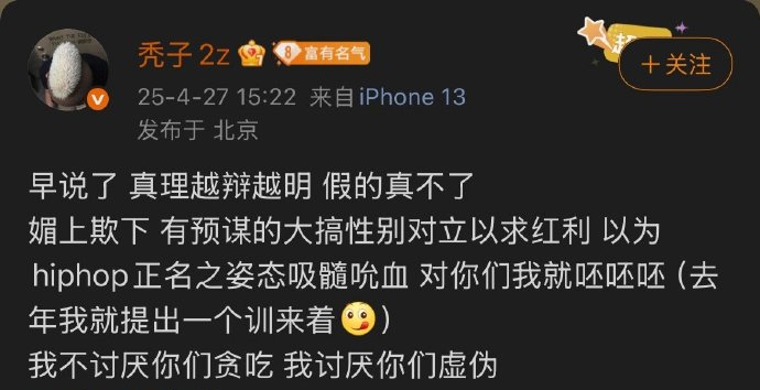 “渴望资本的青睐同时,又要diss资本,某位女rapper diss了又要舔着上资本的节目,只不过是左边的爱奇艺资本没有给到自己想要,马上又报上了右边的腾讯的节目,你不是真的看不上节目,而是你在节目里没有获得想要”