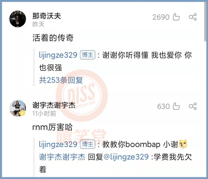 嘻笑堂和离谱说唱每条发文下面,都有人刷“活着的传奇”,以及贝贝的回复“谢懂爱强”。