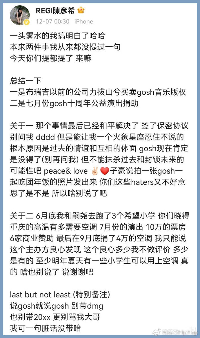 REGI陈彦希也再次表示,GOSH厂牌已经分崩离析。