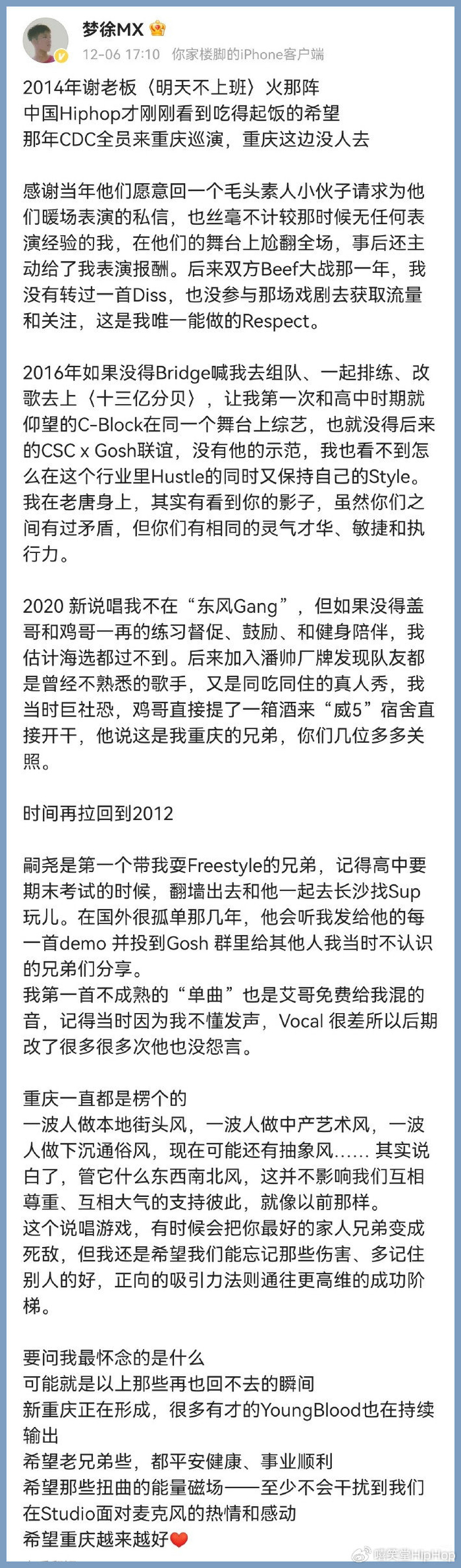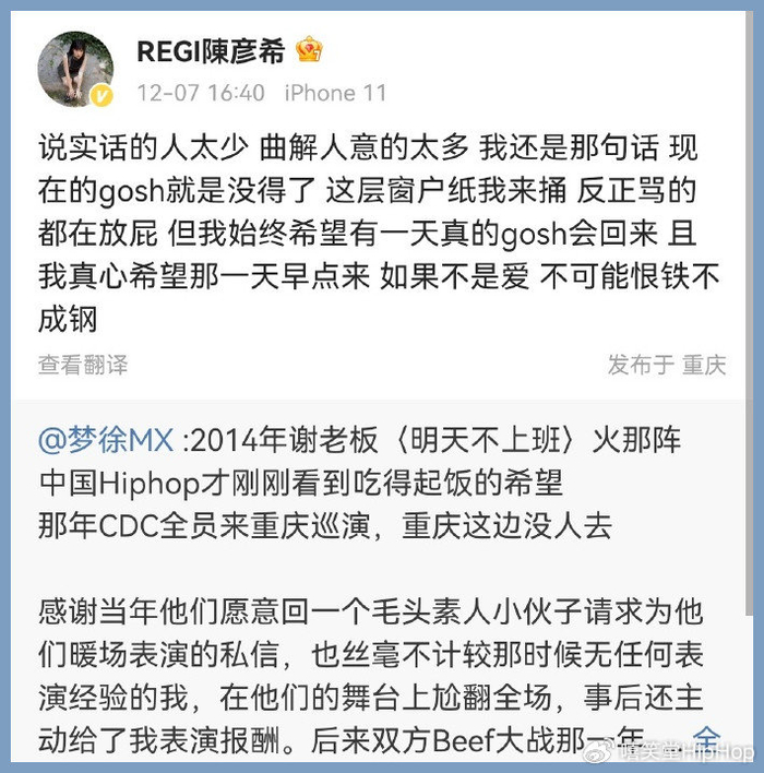 随后,重庆Rapper梦徐发布长文,回忆GOSH往事。